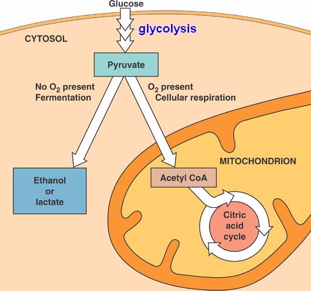 After glycolysis, pyruvate is broken down by fermentation in the cytosol via two catabolic pathways:
