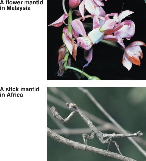 These species of insects called mantids have diverse shapes and colors that are adapted to different environments.