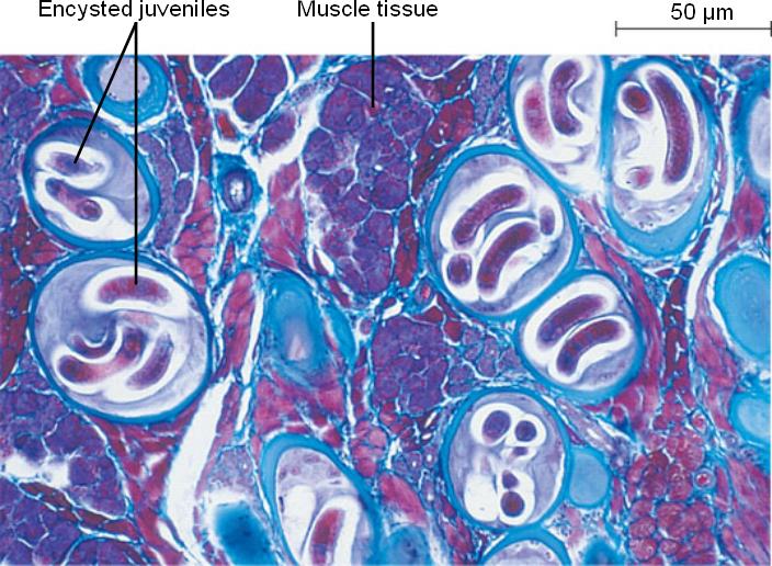 Adults mate in the intestine, producing juveniles, which encyst in muscles.