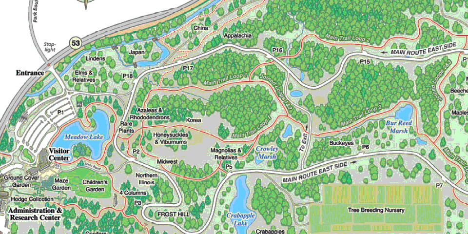 Go across the traffif light at Route 53 into the Arboretum entrance and show the Entrance Fee Waiver form at the gatehouse.
