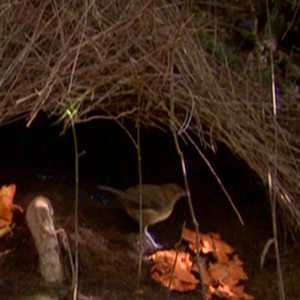 Vogelkop Bowerbird male decorates elaborate bower |