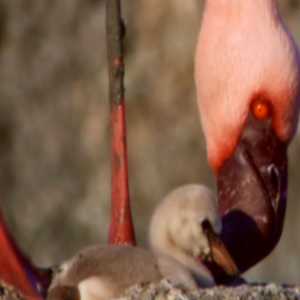Lesser Flamingos nest in caustic soda lake in Ethiopia, cares for chick in nest |