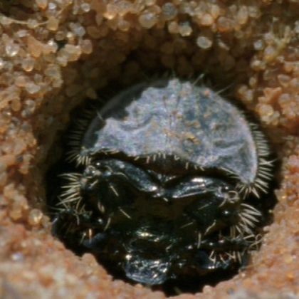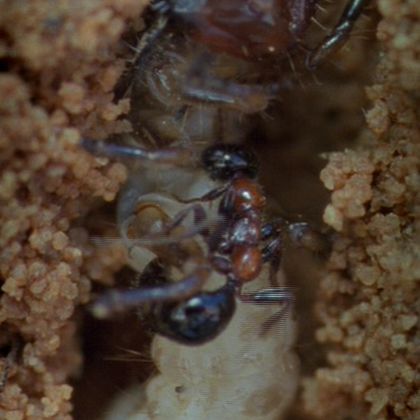 | 34:15 | Fairy Wasp lays eggs inside eggs of water beetles, feed, and mate | 36:30 | Tiger Beetle larva catches ants from burrow | 38:00 | Methoca Wasp oviposits in tiger beetle larva. |